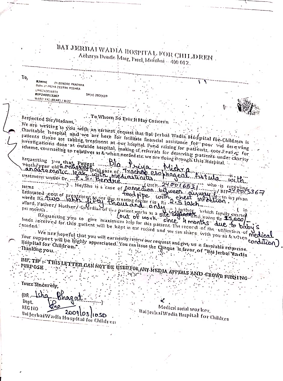 Let's come together to support Baby of Priya Mishra's family in this difficult time. Every contribution, big or small, will bring us closer to giving this child a chance to breathe easy and live a healthy life.