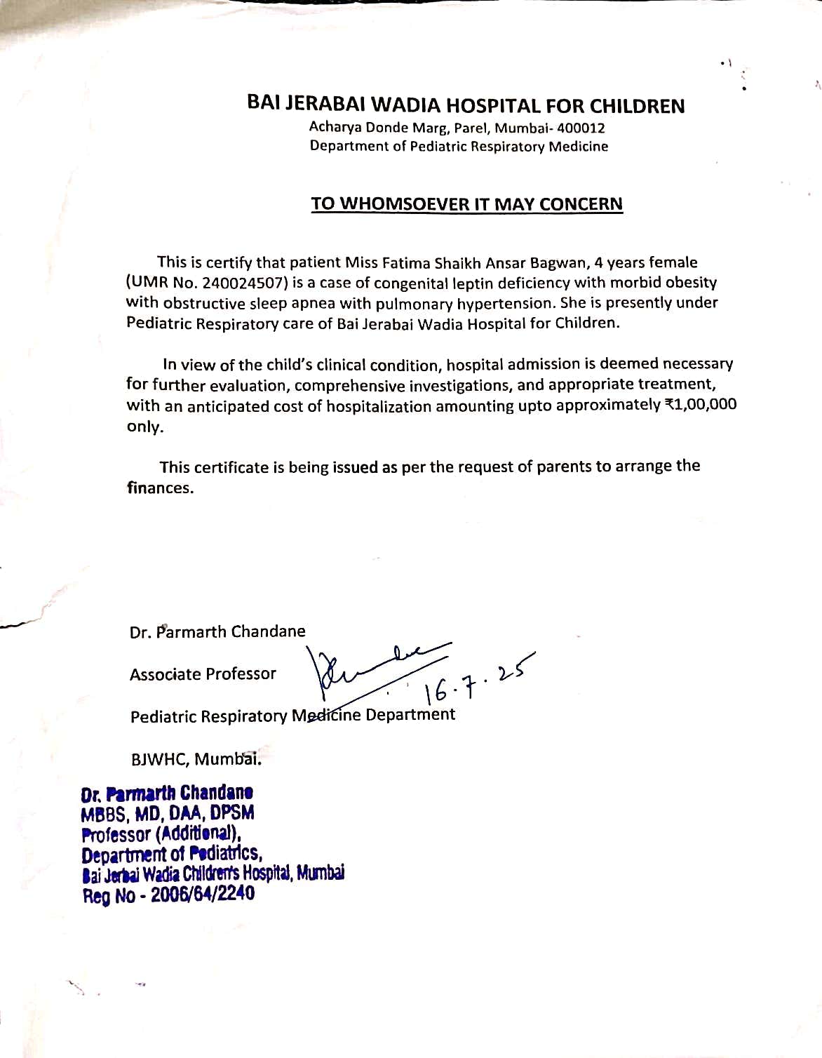 She is currently under treatment at Bai Jerabai Wadia Hospital for Children, Mumbai. Doctors have recommended urgent hospitalization and further treatment, with an estimated cost of ₹1,00,000, which her financially weak family is unable to manage.