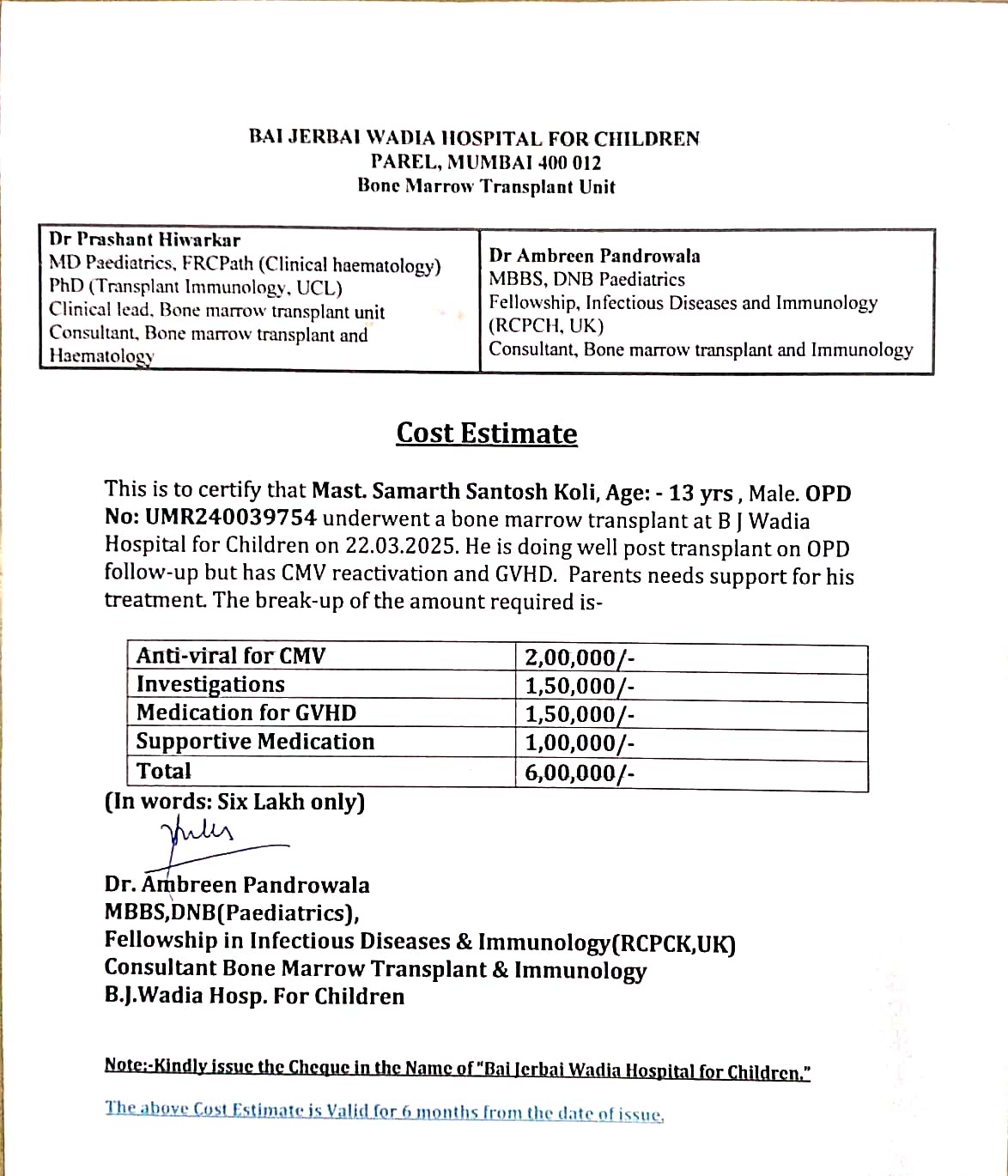 13-year-old Samarth Santosh Koli underwent a bone marrow transplant at Bai Jerbai Wadia Hospital for Children, Mumbai on 22nd March 2025. While he was recovering well, he is now battling serious post-transplant complications — CMV reactivation and GVHD (Graft Versus Host Disease).